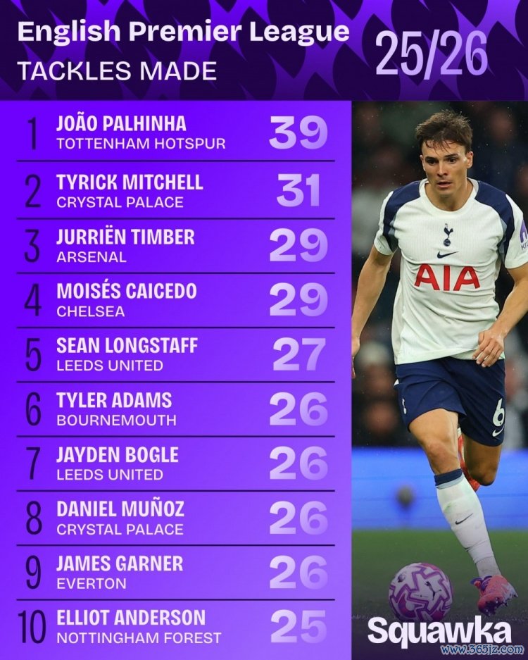 10月28日讯 英超第9轮依然完赛,squakwa也统计了本赛季英超抢断情况,拜仁租将帕利尼亚居首。