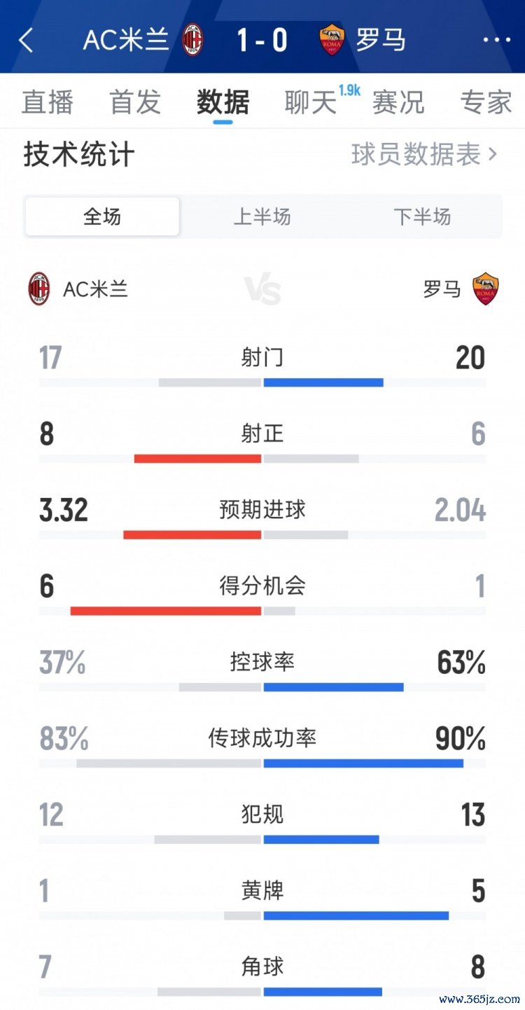AC米兰1-0罗马全场数据:射门17-20,射正8-6,得分契机6-1