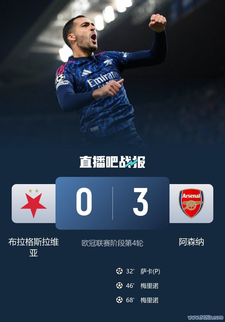 欧冠联赛阶段第4轮,梅里诺梅开二度,萨卡进球,阿森纳3-0轻取布拉格斯拉维亚。