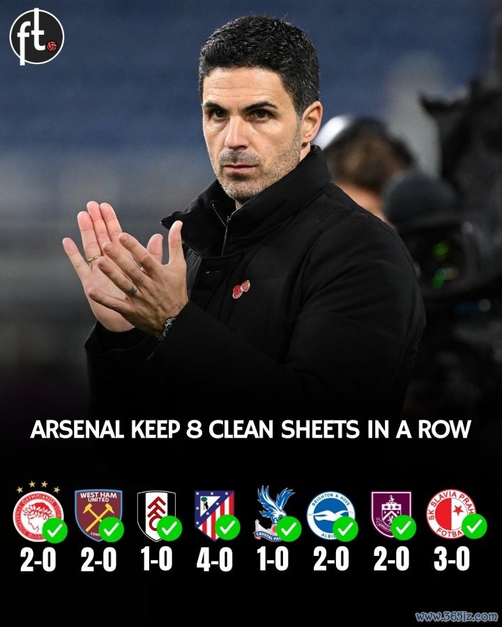 枪手各项赛事现在还是十连胜,且贯穿8场达成零封。据数据统计,阿森纳追平了俱乐部在1903年创造的最长零封场次记录(8场)。