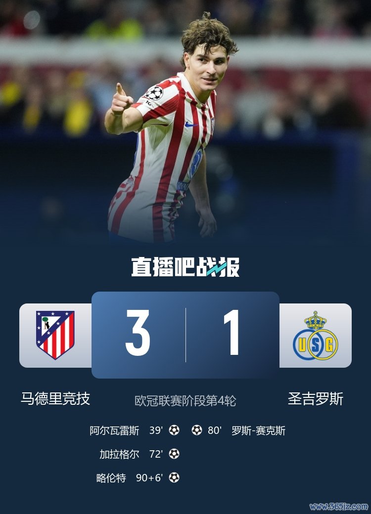 欧冠联赛阶段第4轮,马竞3-1战胜圣吉罗斯,阿尔瓦雷斯、加拉格尔进球。