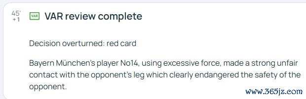官方解说:“决定推翻:红牌。拜仁14号球员使用过度力量,与对方球员腿部发生明显不耿介战争,严重危及对方球员安全。”