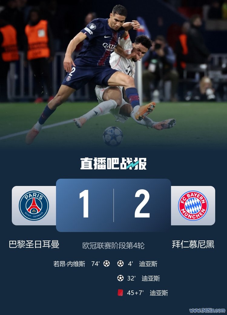 欧冠联赛阶段第4轮,拜仁2-1战胜巴黎,迪亚斯梅开二度后染红。
