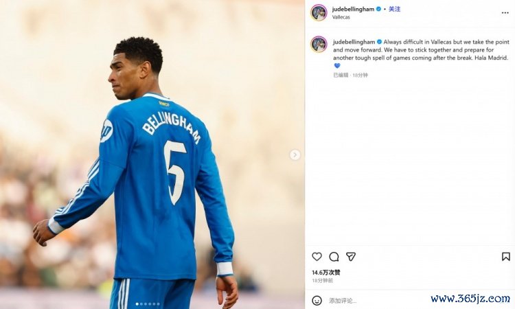 贝林厄姆晒出我方的比赛照,并配文:“客战巴列卡诺老是很忙绿,但咱们拿到了一分并连接上前看。咱们必须和洽一致,为国度队比赛周之后的又一轮密集赛程作念好准备。马德里前进!”