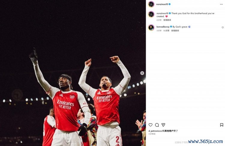本场比跑马杜埃凯打进个东谈主阿森纳活命处子球,赛后他也在社媒晒出与队友庆祝进球的合照,配文写谈:“感谢天主创造如斯棒的昆玉情感!”