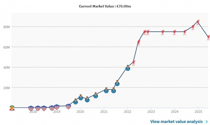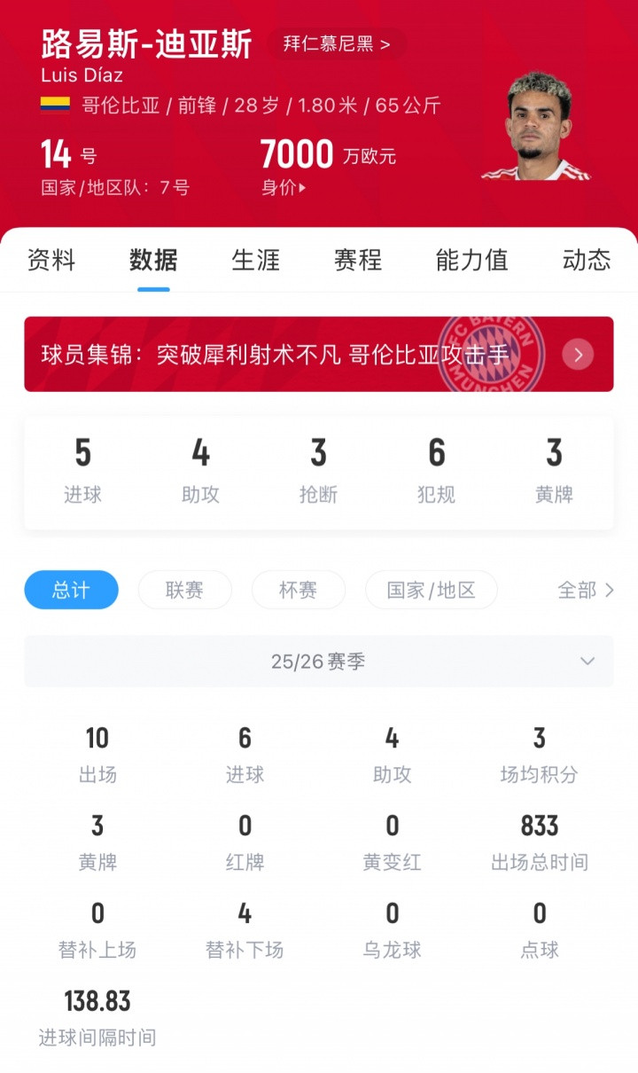 迪亚斯的巅峰身价为2024年的8500万欧,本年五月底,迪亚斯的身价从8500万下落至7000万。在拜仁的无缺开局并没能匡助他的身价回调。