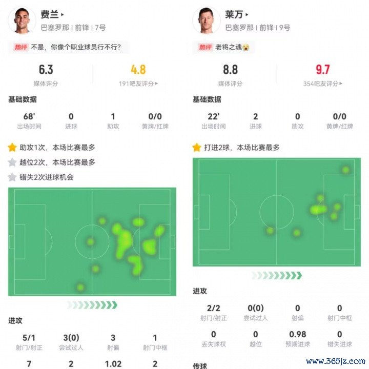比较之下,替补费兰登场的37岁宿将莱万多夫斯基则显得现象更佳:他在替补登场的22分钟内打进了2粒进球,而且各个精彩。