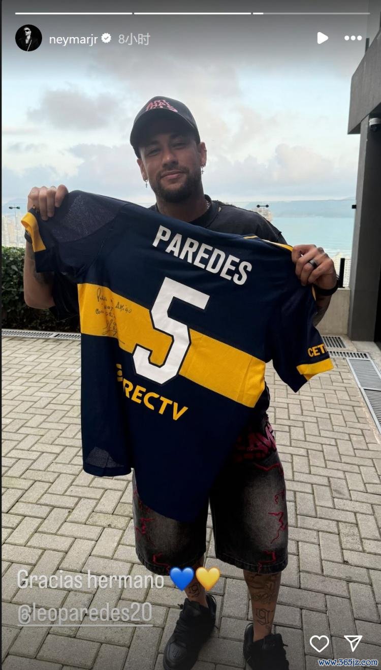 内马尔也晒出手拿帕雷德斯球衣的像片,配文:“感谢兄弟。”