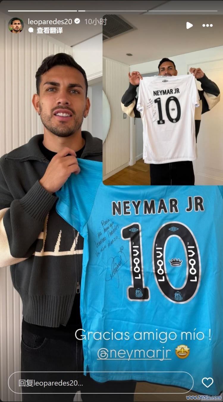 内马尔、帕雷德斯互赠球衣,社媒晒照示意感谢