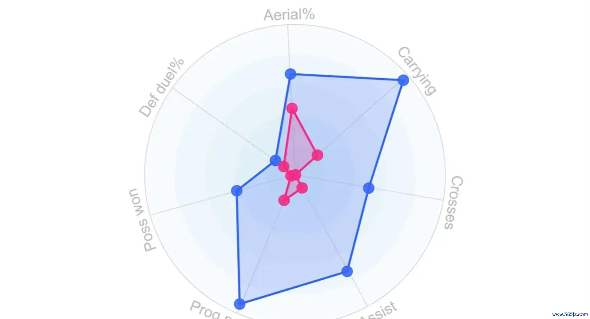 职责量数据证据了这少许:卡雷拉斯刻下的产出(蓝色)与门迪上赛季(红色)比拟自大出远大各异,尤其是在鞭策传球、传中庸预期助攻方面。