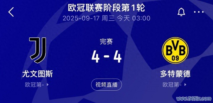直播吧09月17日讯 欧冠尤文vs多特,两边上半场0-0闷平,下半场两边进8球!