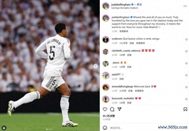 贝林厄姆社媒追忆复出: 额外思念大家, 感谢主场球迷们的复旧