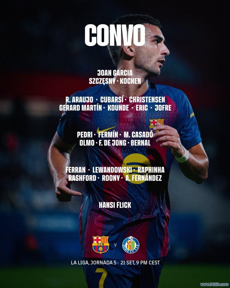 巴萨战赫塔费大名单:莱万领衔,亚马尔缺席,库巴西在列