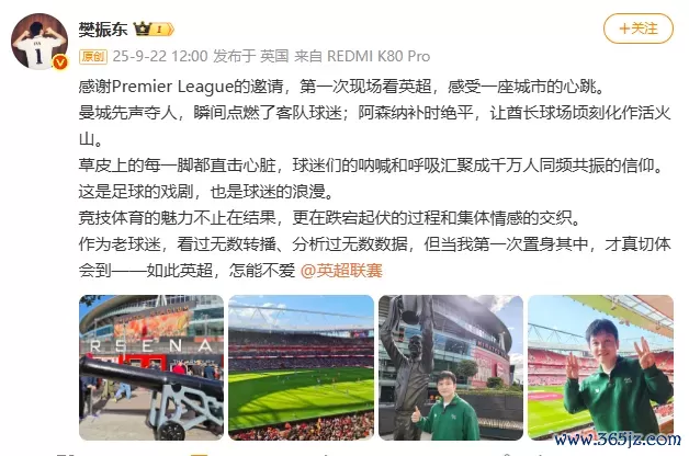樊振东第一次现场看英超: 算作老球迷第一次踏进其中, 体会到“如斯英超, 岂肯不爱”