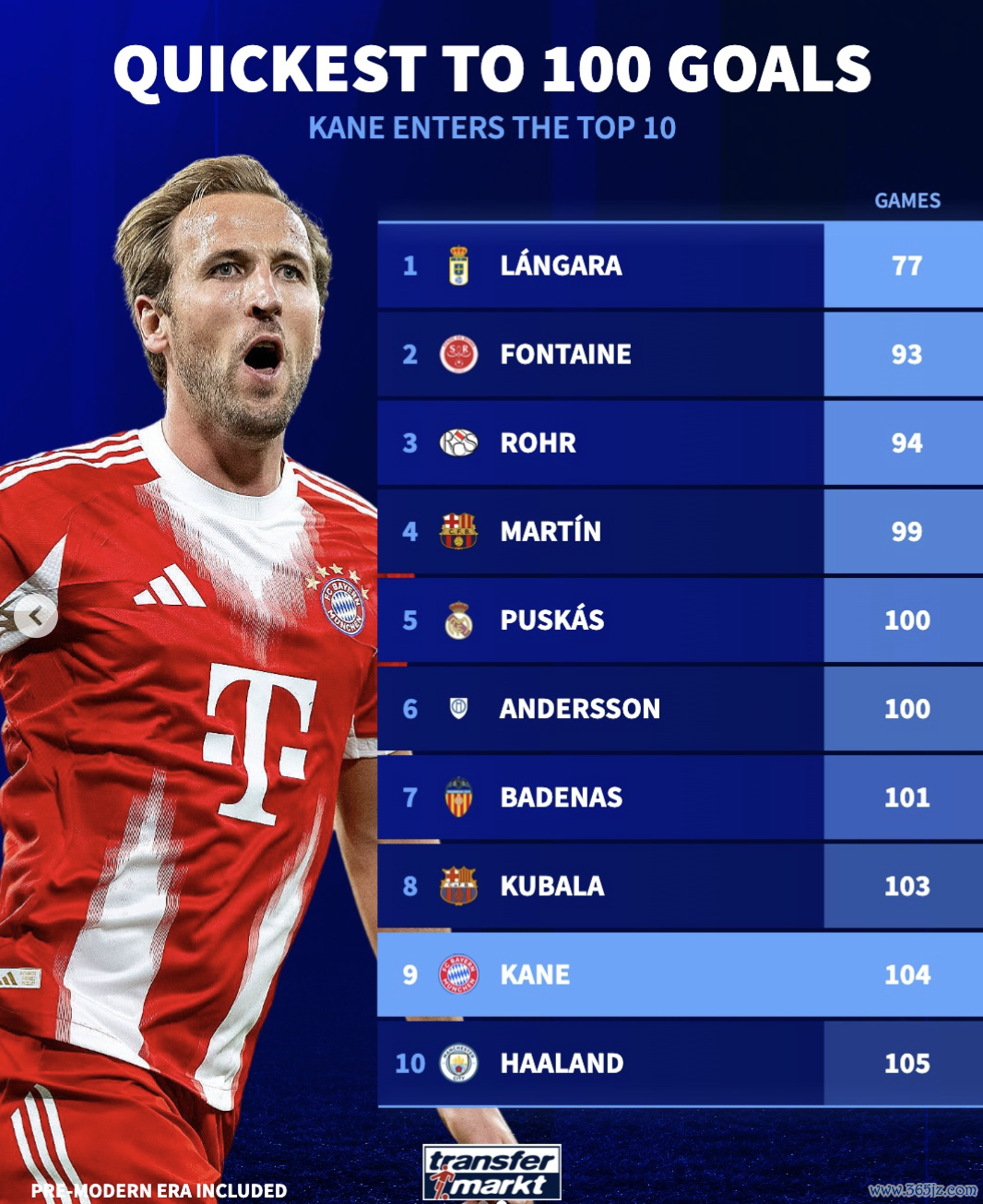 史上最快进百球所需场次: 凯恩104场排第9, 至极哈兰德和C罗