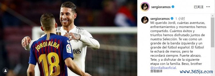10月8日讯 西班牙边卫阿尔巴将在本赛季逼迫后退役,拉莫斯社媒发文致意。