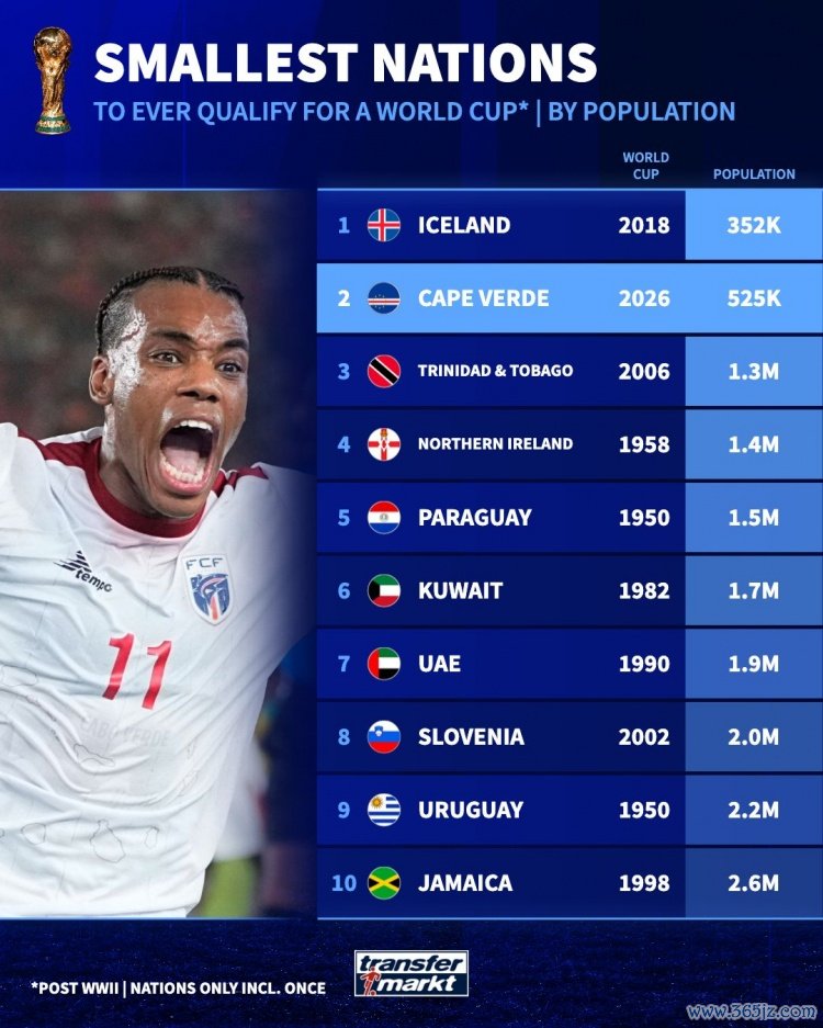 10月15日讯 德国转会阛阓列出了干与寰宇杯东谈主口最少的国度,冰岛居首,佛得角次席。