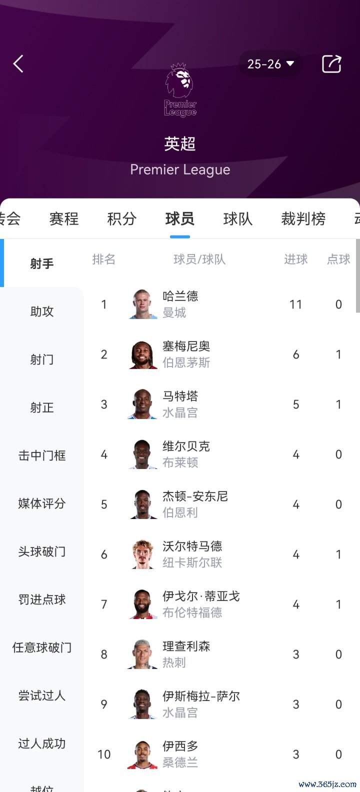 10月19日讯 英超第8轮部分比赛放置,最新的英超弓手榜:哈兰德11球领跑,本轮比赛打进2球完了联赛进球数上双;塞梅尼奥6球第2,马特塔凭借本轮联赛的帽子戏法进球来到5个,在弓手榜上位居第3名。维尔贝克、杰顿-安东尼、沃尔特马德、伊戈尔-蒂亚戈均打进4球,比肩第4。