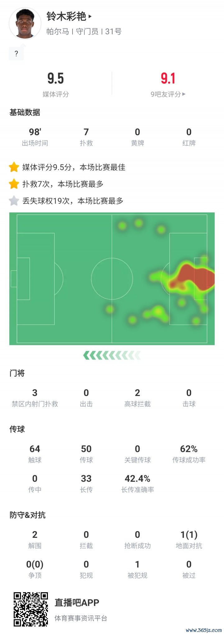 太强了!铃木彩艳压哨扑点救主+7扑救 单场9.5分助十东谈主帕尔马拿分