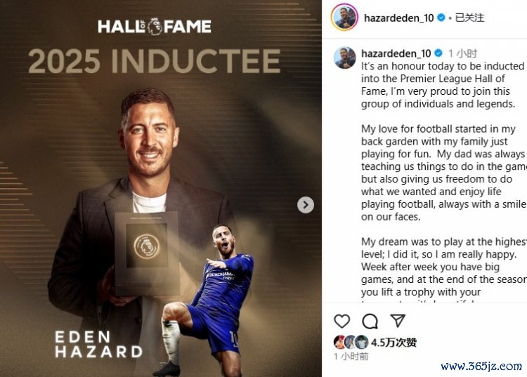 进英超名东谈主堂!阿扎尔:奖杯也属于队友妥协释,你们是我的全天下