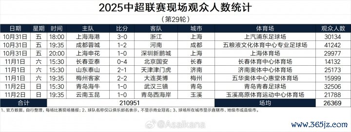 2025中超联赛现场不雅世东说念主数统计(第29轮)