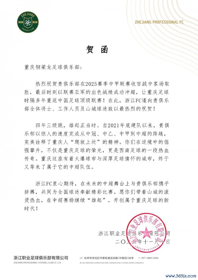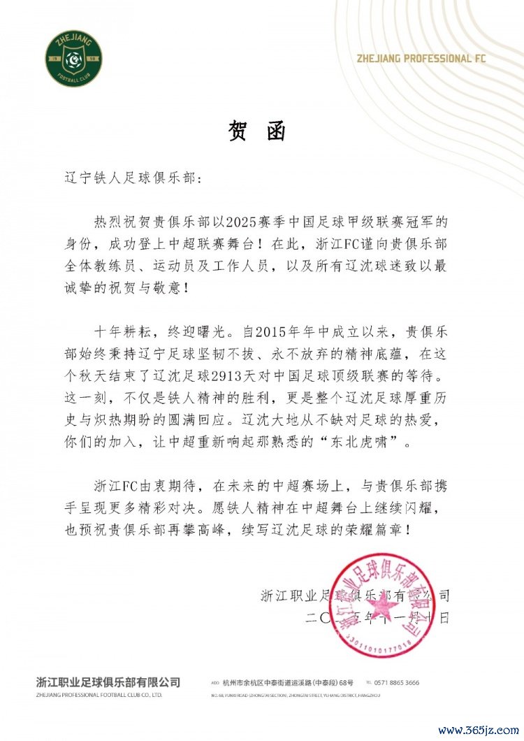浓烈祈福贵俱乐部以2025赛季中国足球甲级联赛冠军的身份,得胜登上中超联赛舞台!在此,浙江FC谨向贵俱乐部整体素养员、通顺员及使命主谈主员,以及通盘辽沈球迷致以最真挚的祈福与敬意!
