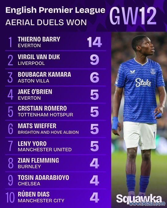 数据统计线路,巴里在本场比赛觉得完成了14次收效争顶,这亦然本赛季英超单场最多。算作对比,本轮英超联赛收效争顶第二多的范戴克也仅有9次。