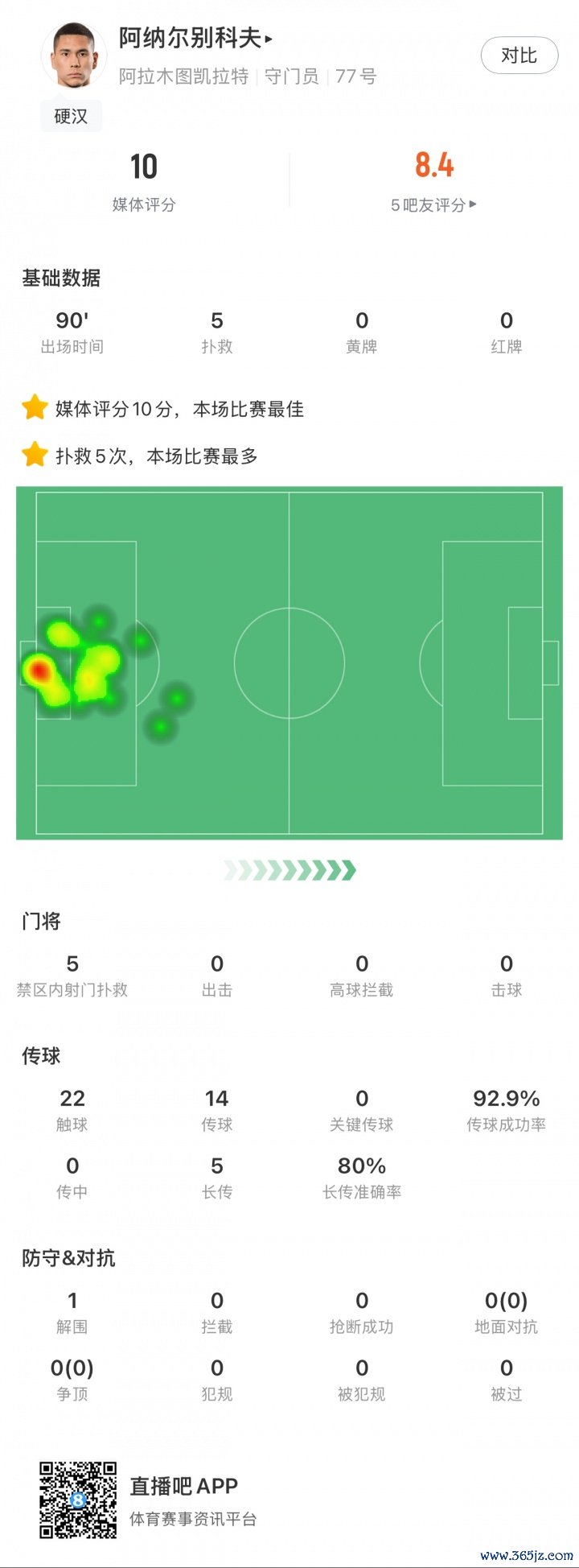 10月22日讯 欧冠联赛阶段第3轮,阿拉木图凯拉特主场0-0战平十东说念主帕福斯,主队的哈萨克斯坦门将阿纳尔别科夫5次扑救获评10分满分!