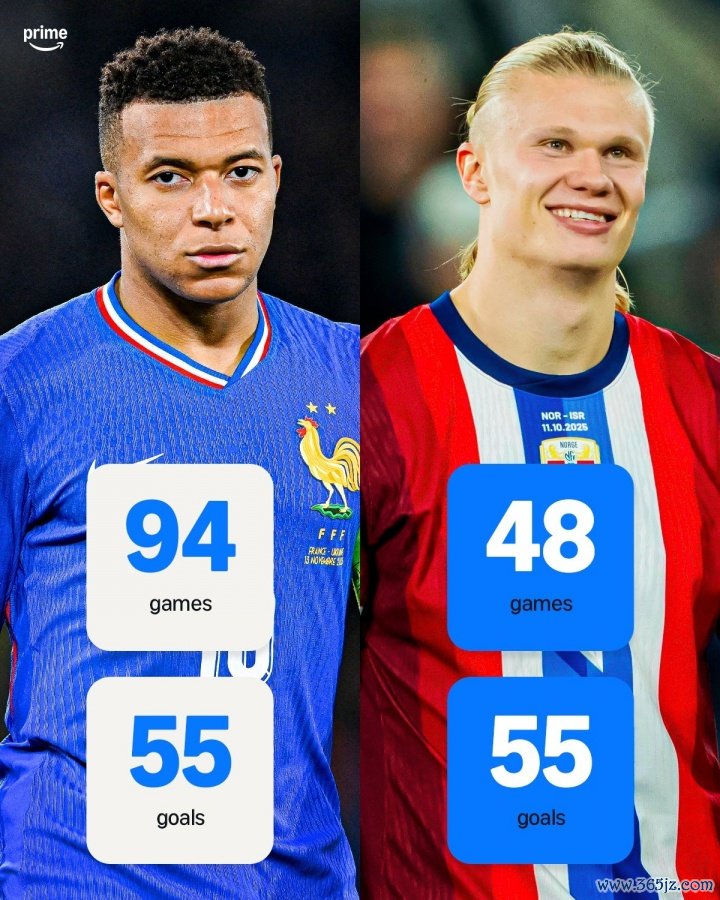 哈兰德与姆巴佩的国度队进球数通常,但姆巴佩所用场次为94场,哈兰德场次仅为姆巴佩的一半多小数。